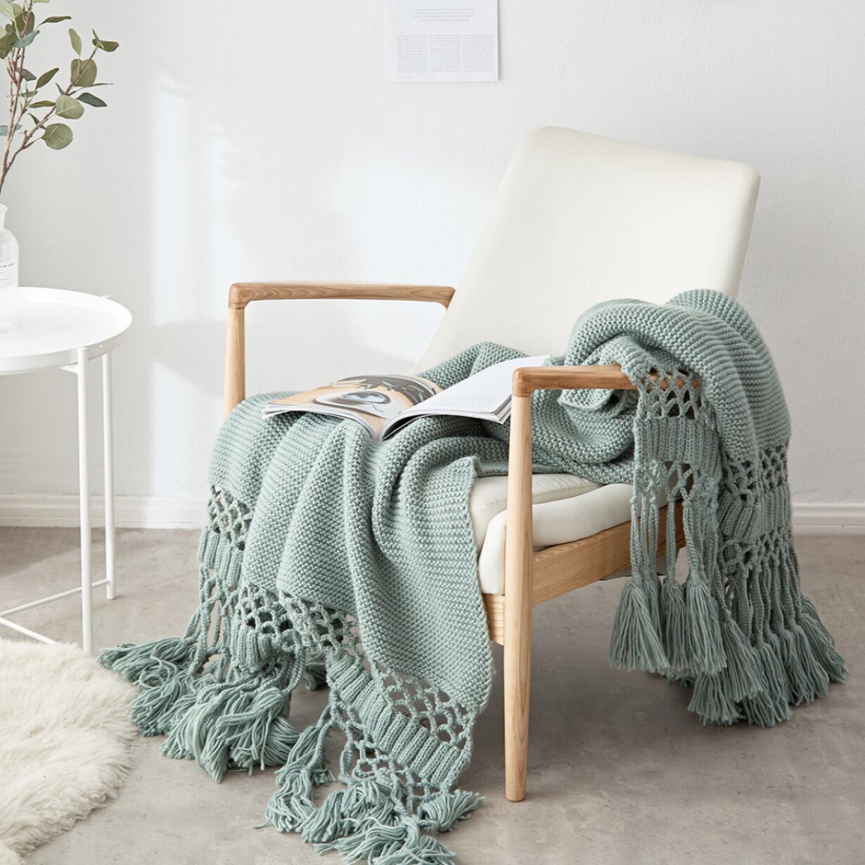 タッセル フリンジ付き ニットブランケット 膝掛け 大判 アイボリー
