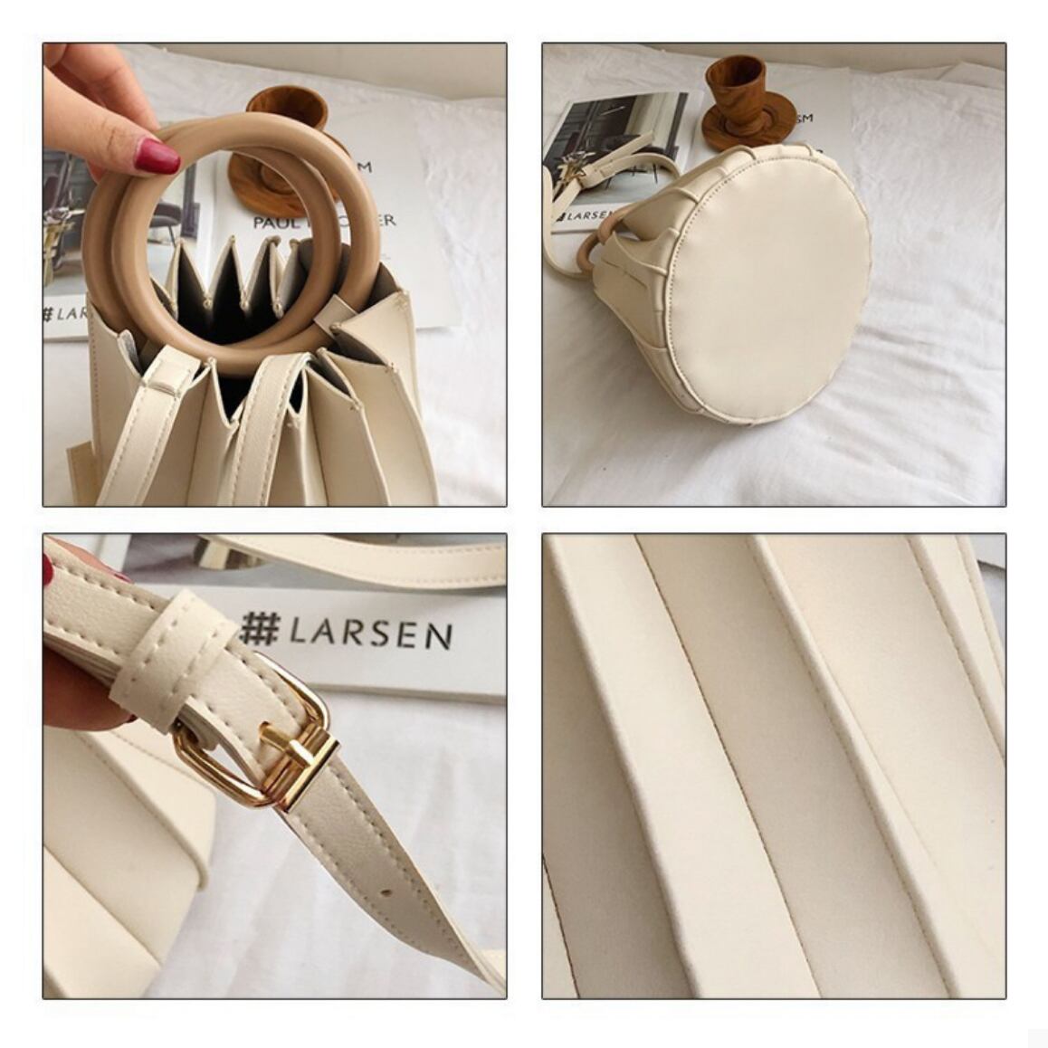 プリーツバッグ 【ブラウン】2way ハンドバッグ PUレザー バケツバッグ 円形 肩掛けカバン ショルダーバッグ 手提げ 斜め掛け 大人可愛い ウッド風ハンドル